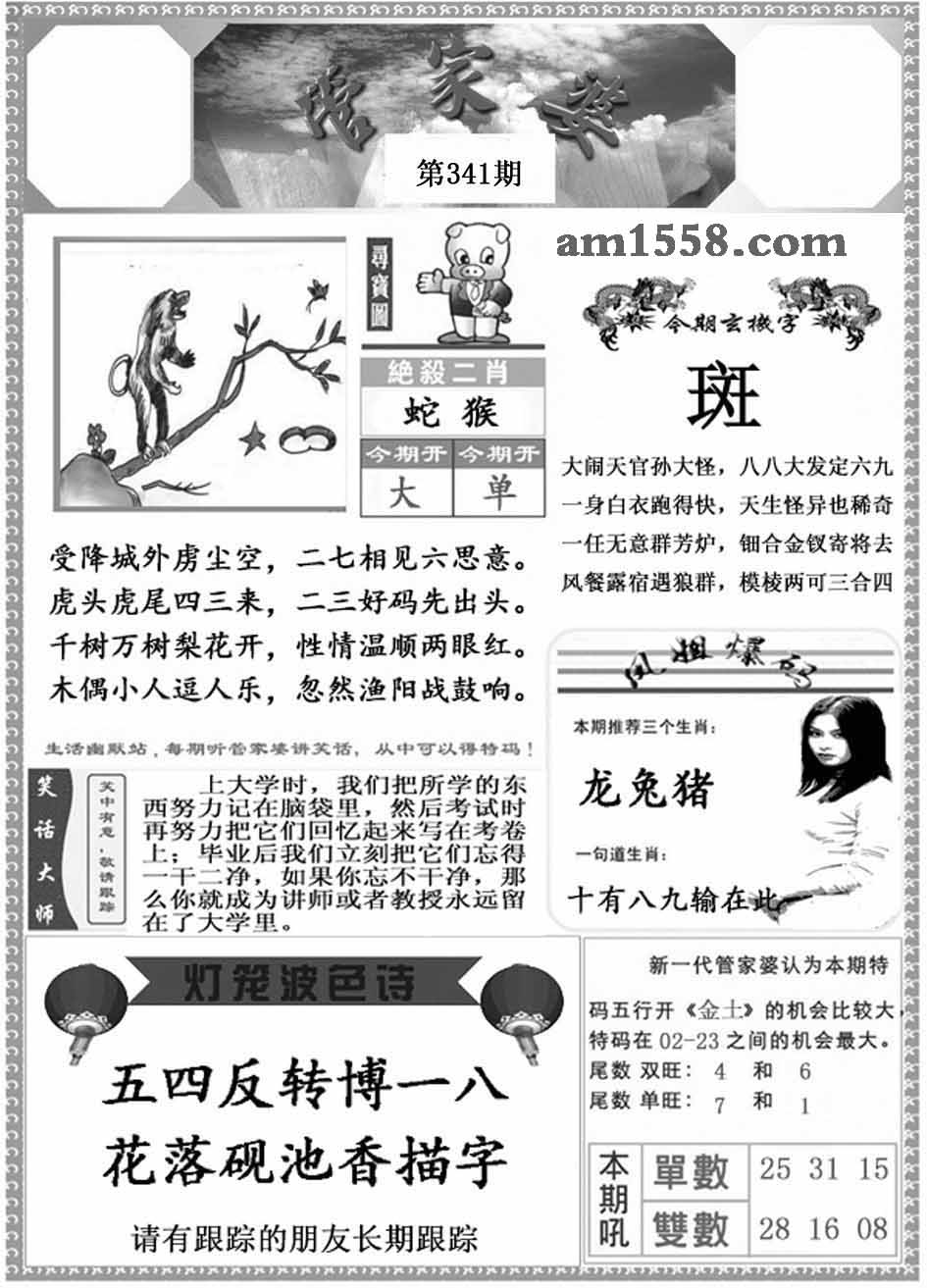 | 340期-绝杀③肖【猴狗蛇】开:虎28 |